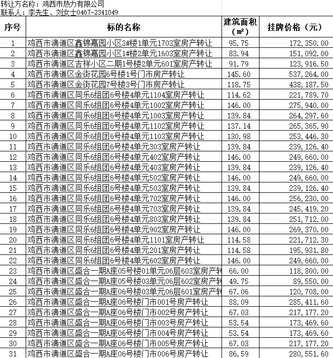 【重點項目】雞西市熱力有限公司57處房產(chǎn)分別轉讓